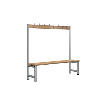 Probe budget single sided cloakroom unit manufactured from 38mm square tube steel finished in Silver with Ash seat slats and Grey hooks.