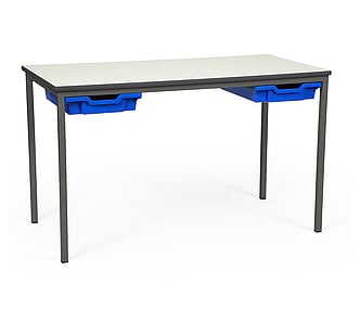 The student table has metal runners welded beneath the worktop to allow plastic trays to easily glide in and out. Each table will store up to two trays which are available in a wide choice of colours.