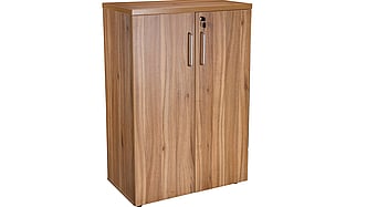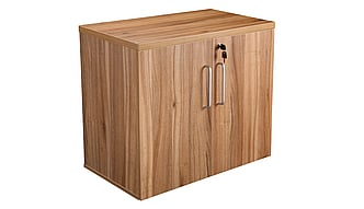 Desk high double door executive cupboard complete with one shelf and silver handles. 30mm thick top. Dimensions are 800mm wide x 450mm deep x 730mm high.