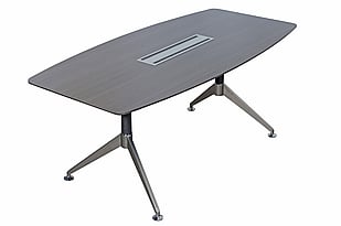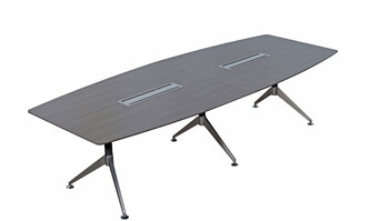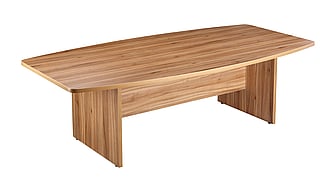 Boat shaped executive boardroom table with a 30mm thick top mounted on a 30mm thick panel end base section.