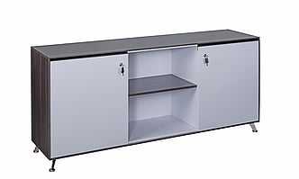 This executive credenza sits on stylish silver legs and has two locking white wooden doors and one central open section complete with shelves.