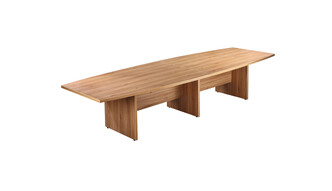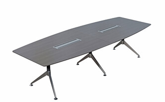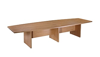 Boat shaped executive boardroom table with a 36mm thick top mounted on a 36mm thick panel end base section.