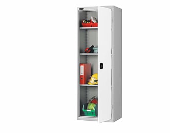 Tall single door cupboard complete with three fully adjustable shelves.