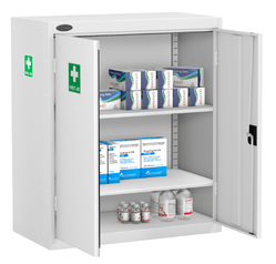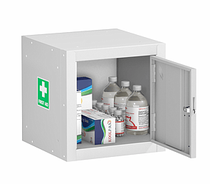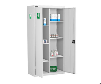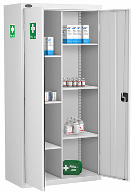 Under the Health and Safety Regulations 1981, workplaces must have first aid provision. This highly visible range of cupboards offers a practical solution for all workplaces. Reinforced doors. High visibility 270 degree labelling complying to BS5499-1.