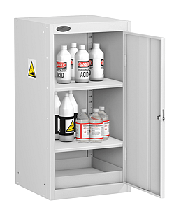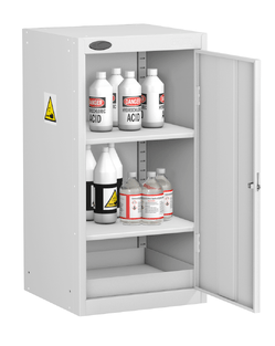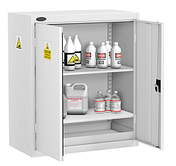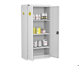 The storage of caustic materials needs to be controlled. These cabinets will allow safe storage of acids and alkalis in a range of highly visible units. Durable epoxy polyester white coating giving a surface resistant to most acids and alkalis. Two point locking on all two door cabinets.