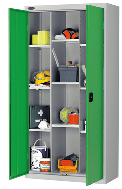 Tall double door cupboard complete with nine fully adjustable shelves and two vertical dividers.